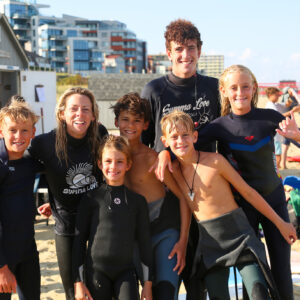 Safety First. Always. Our 3.5-hour surf camp features small group instruction with 2–4 students per instructor and approximately 2–2.5 hours of actual surf time each day. When ocean conditions are rough, we adapt. Camps shift to 1-on-1 instruction, rotating surfing with body surfing, beach games, and skill-building activities — ensuring safety, confidence, and fun at all times.
